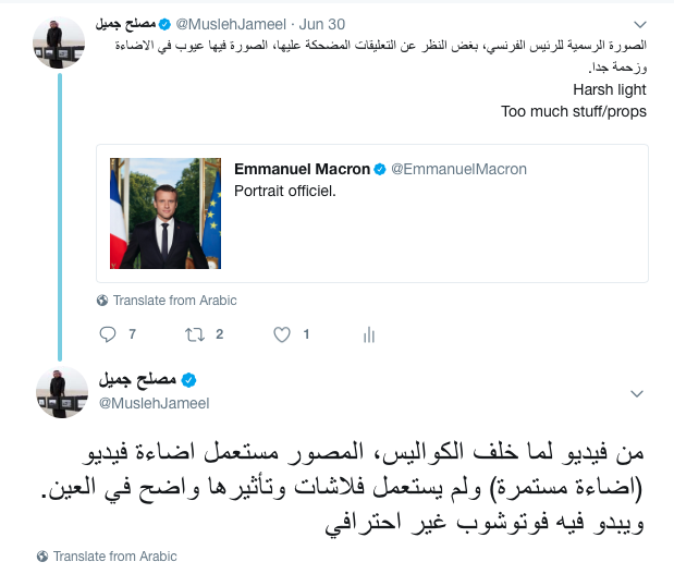 من وجهة نظري الشخصية انها صورة جميلة ومعاصرة ومختلفة (مختلفة عن الصور الرسمية لروؤساء دول العالم) ولكنها مزدحمة بالدلالات وبالتأكيد واضح تأثير الفوتوشوب كما ذكرت في تغريدة لي على تويتر، ومن ناحية فنية وكما شاهدت في فيديو ماخلف الكواليس فأن المصورة استعملت اضاءة مستمرة ( اضاءة تستعمل لتصوير الفيديو ويلجأ لها بعض مصوري البورترية) ولكنها -من تجربتي الشخصية – سيئة لتصوير الاشخاص اذ تؤثر بشكل كبير على عين الشخص وتجعل بؤبؤ العين يصغر وبالتالي تظهر العين بشكل غير طبيعي. ايضا قد تؤثر بشكل كبير على الطريقة التي ينظر بها الشخص نتيجة توهج الاضاءة مما يجعل الشخص ينظر بطريقة غير طبيعية ( وفي هذه الصورة لا يتضح هذا التأثير بشكل كبير). ايضا قد تؤثر الاضاءة المستمرة على البشرة لما تصدره من حرارة، خاصة في حال وقوف الشخص لفترة طويلة امام الاضاءة. المشكلة الاخرى هي وقفة الرئيس ( pose) التي فيها تكلف واضح. ايضا في ما يبدو لي عدم تناسق درجة الاضاءة المستعملة على الرئيس مع الاضاءة الخارجية او بالاصح ( white balance) ولو كان بالامكان اضافة فلتر بالفوتوشوب cooling filter بنسبة ( 5%) لكان افضل وهذا ذوق شخصي. (اضغط هنا لترى ما أعنيه بالتعديل على لون الاضاءة). ايضا المصورة استعملت حساسية عالية نوعا ما (iso 800) و فتحة عدسة f10 بينما كان بالامكان من وجهة نظري الشخصية تقليل الحساسية واستعمال فتحة عدسة اوسع f8 او f5.6 . النسخة الكبيرة للصورة المتوفرة للطباعة على موقع قصر الاليزية . واذا كنت مصور ويهمك ان تعرف الكاميرا المستعملة فهي cannon 5D Mark IV والعدسة المستعملة Canon EF 24-70mm f/2.8L II USM